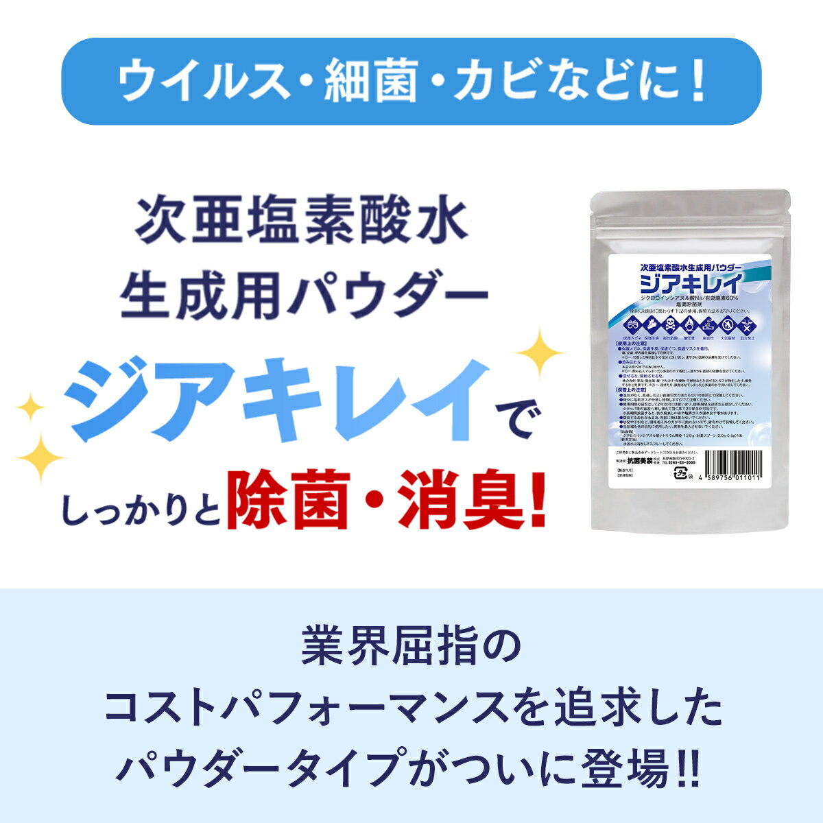 【 次亜塩素酸水の力でしっかりと除菌・消臭! 】業界屈指のコストパフォーマンスを追求した次亜塩素酸水生成用パウダー「ジアキレイ」がついに登場! ウイルス・細菌・カビ・気になるニオイ対策などに! 次亜塩素酸水の力でしっかりと除菌・消臭! 【 内容物 】ジクロロイソシアヌル酸ナトリウム顆粒120g(60g×2袋)計量スプーン(大さじ2.0g・小さじ0.5g)1本【 1袋だけで「濃度50ppm」の次亜塩素酸水が「約1,440リットル分」! 】この1袋(120g)だけで、空間除菌などに適すると言われる「濃度50ppm」の次亜塩素酸水が、なんと「約1,440リットル分」も作れる! 市販でよく流通している濃度500ppmの次亜塩素酸水なら、1袋で約144リットル分! 濃度1,000ppmの次亜塩素酸水なら、1袋で約72リットル分!業界内でも圧倒的なコストパフォーマンスの良さで次亜塩素酸水を生成できます!【 濃度を調整して色んな用途に使える! 】ジアキレイなら水で薄めて濃度を調整できるので、「除菌」や「消臭」など色んな用途に使えます!【 除菌・使用例 】ウイルス対策・空間除菌(超音波噴霧器で部屋除菌)・カビ対策・ドアノブ・スマホ・トイレ・キッチンまわり・ペットまわり・介護用品など。